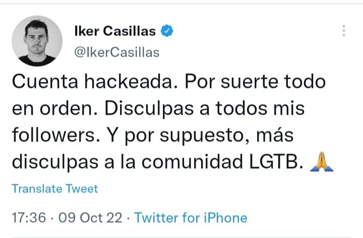 اعتذر ايكر كاسياس عن التغريدة التي نشرت عبر حسابه بتويتر والتي أعلن فيها أنه شاذ جنسيًا قبل ساعات في نهار اليوم الأحد.