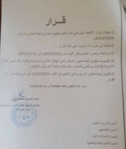 وطالبت بتكوين لجنة تفتيش إداري ومالي للنادي من التاسع والعشرين من أغسطس 2020 إلى تاريخ إصدار القرار.