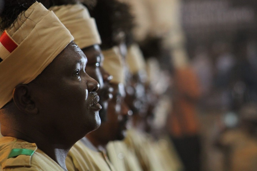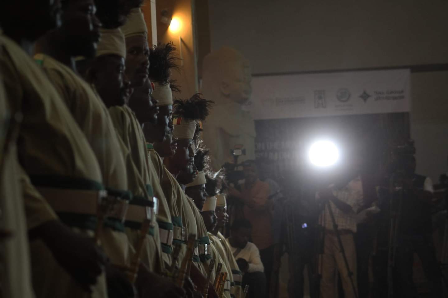 محاطا بجنود الحرس الجمهوري والحضور، يقف تمثال الملك “ترهاقا” وكأن شخصه قد برز من عمق التاريخ ليتصل ويتواصل مع أحفاده.