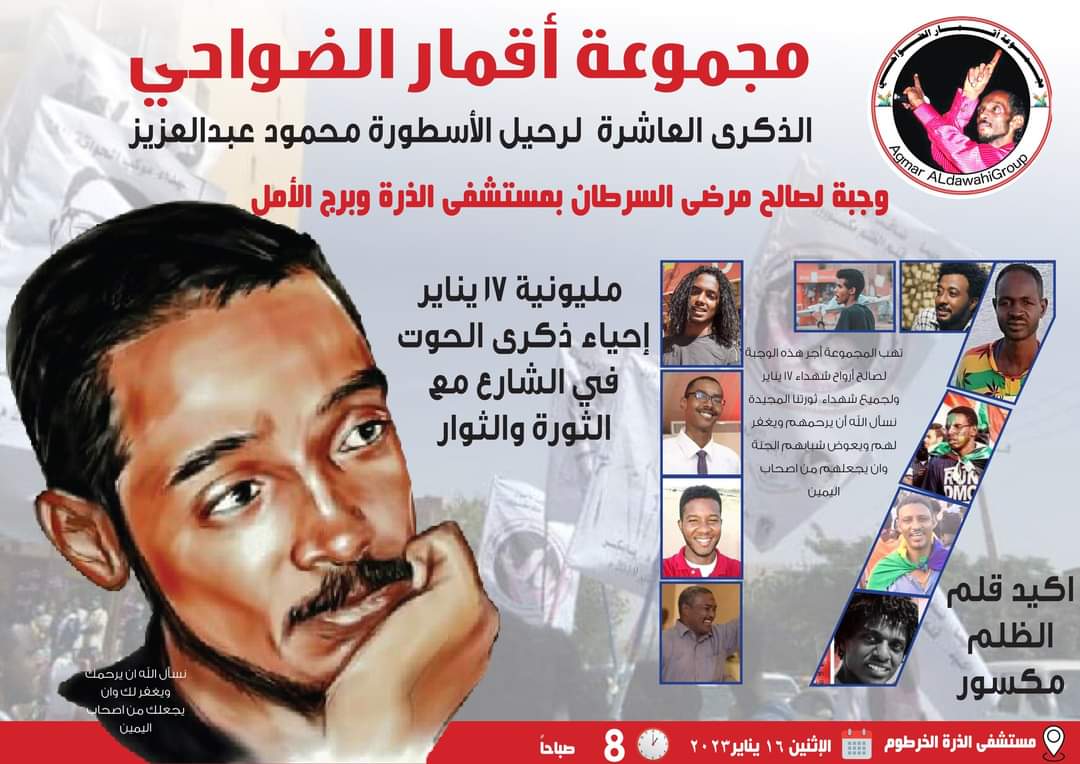 وأضاف “خصصنا أجر هذه الوجبة لشهداء الثورة المجيدة وأرواح شهداء يوم 17 يناير/ كانون ثاني 2019 وهم الشهيد الدكتور بابكر عبدالحميد والشهيد معاوية بشير ولروح الشهيد الفاتح النمير الذي أصيب في هذا التاريخ، واستشهد لاحقا، وكذلك لشهداء مجزرة 17 يناير/ كانون ثاني 2022م، وهم الشهيد مضوي والشهيد سراج الدين والشهيد حسن إبراهيم والشهيد بشير علي (بيشو) والشهيد عبدالله الشريف والشهيد إسحق آدم هارون والشهيد الحاج مالك الحاج، سائلاً الله أن يرحمهم ويغفر لهم ويعوض شبابهم الجنة وأن يجعلهم من أصحاب اليمين.