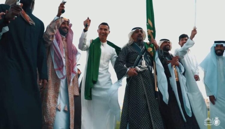 وظهر رونالدو في مقطع فيديو مع صور نشرها الحساب الرسمي للنصر عبر “تويتر”، وهو يرتدي الزي التراثي السعودي “المرودن”، ويؤدي العرضة (رقصة شعبية تؤدَّى في المناسبات الوطنية).
