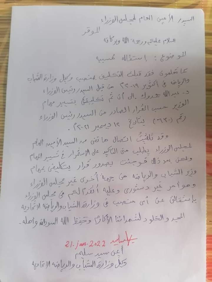 وجاءت الخطوة رفضاً للقرار الذي أصدره رئيس مجلس السيادة، الفريق أول عبد الفتاح البرهان بتكليفه بمهام الوزير معتبراً أن تكليفه من أي جهة غير مجلس الوزراء تعتبر قراراً غير دستوري.