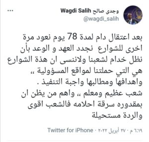 وغرد مقرر لجنة التفكيك وجدي صالح على حسابه بموقع توتير قائلا: “بعد اعتقال استمر لمدة 78 يوما نعود مرة أخرى للشوارع نجدد العهد والوعد بأن نظل خداما لشعبنا ولا ننسى أن هذه الشوارع حملتنا لمواقع المسؤولية، وأهدافها ومطالبها واجبة التنفيذ، شعب عظيم ومعلم واهم من يظن أن بمقدوره سرقه أحلامه فالشعب أقوى والردة مستحيلة”.