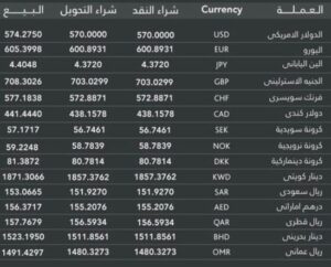 واستقر سعر الصرف لدى البنوك، حيث بلغ أعلى سعر لصرف العملة الأمريكية 580 جنيهاً كأعلى سعر له مقابل 560 جنيهاً كأدنى سعر.